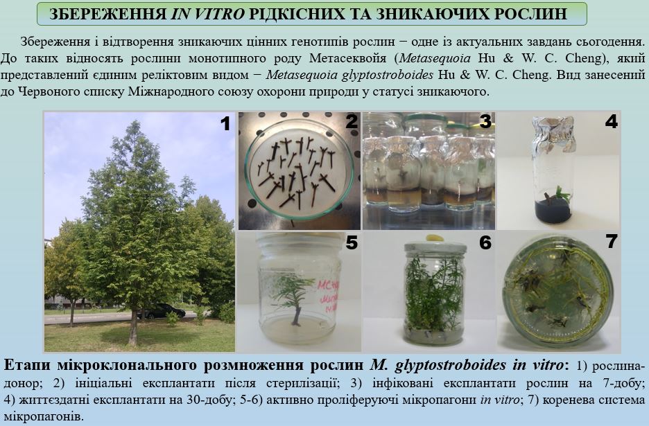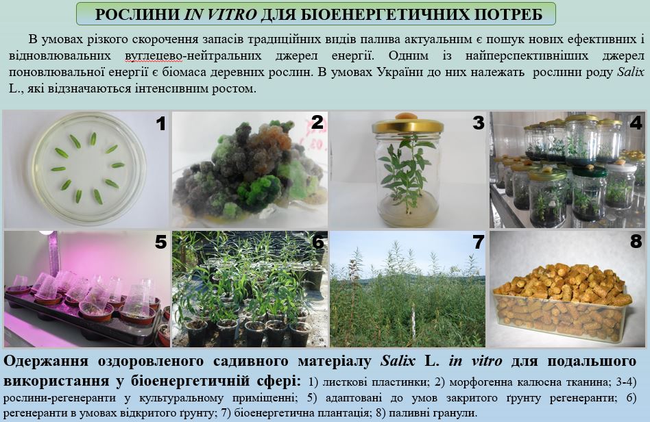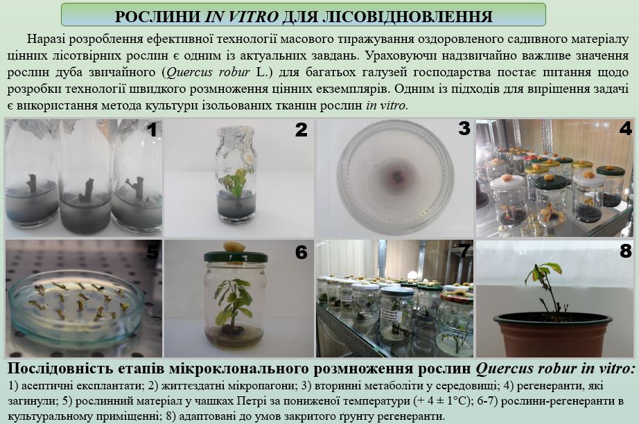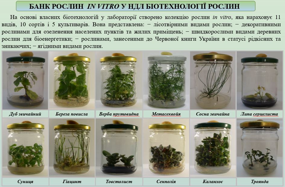 Науковими співробітниками НДЛ біотехнології рослин ВП НУБіП України «Боярська ЛДС» здійснено низку фундаментальних та прикладних досліджень щодо розроблення ефективних протоколів розмноження в культурі тканин in vitro деревних, декоративних та ягідних видів рослин із одержанням високоякісного садивного матеріалу. Зокрема, наводимо біотехнологічний процес отримання зникаючих, лісотвірних та біоенергетичних рослин in vitro із фрагментів тканин на штучних живильних середовищах (починаючи від введення в умови in vitro і закінчуючи адаптацією/створенням плантації/одержанням біопалива). Наші розробки захищені Патентами України на корисну модель.