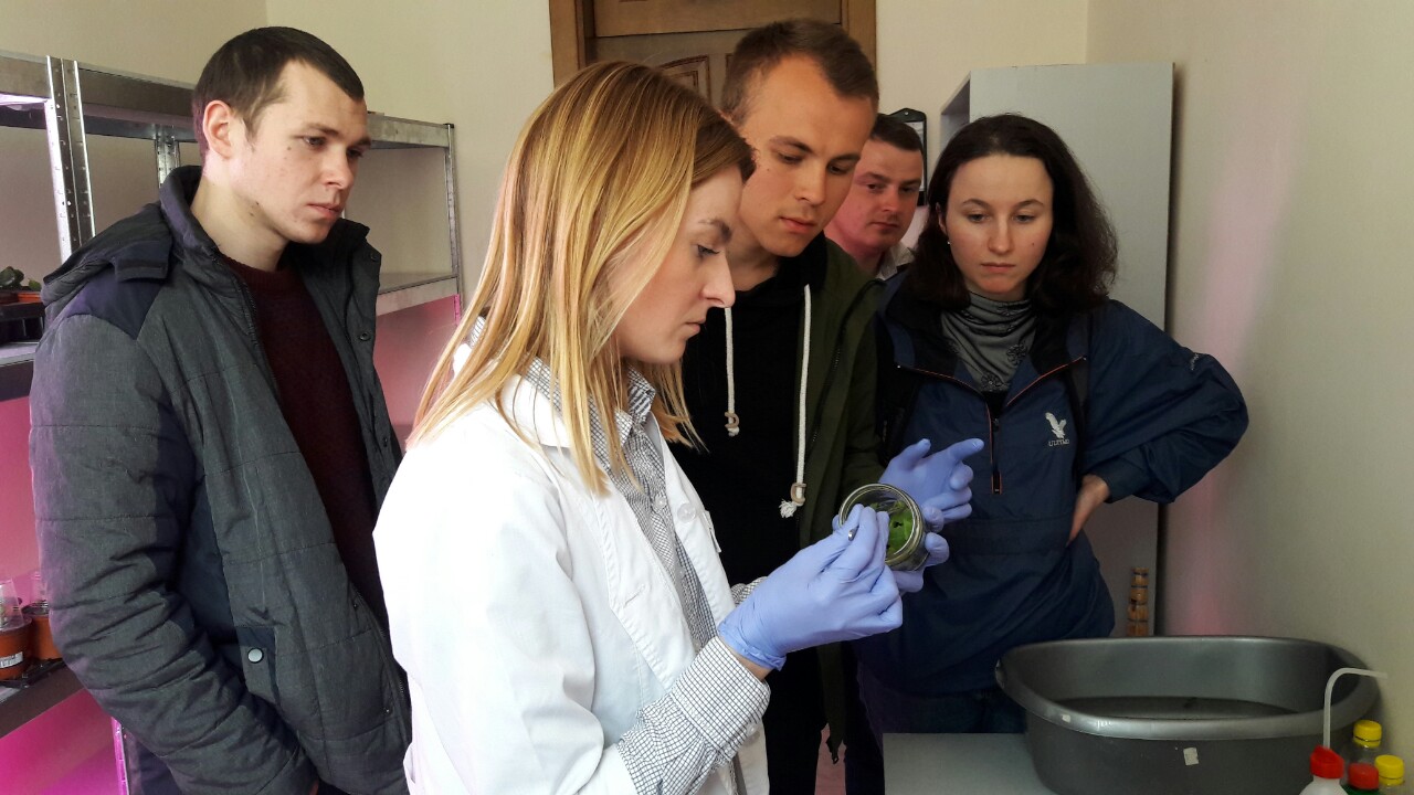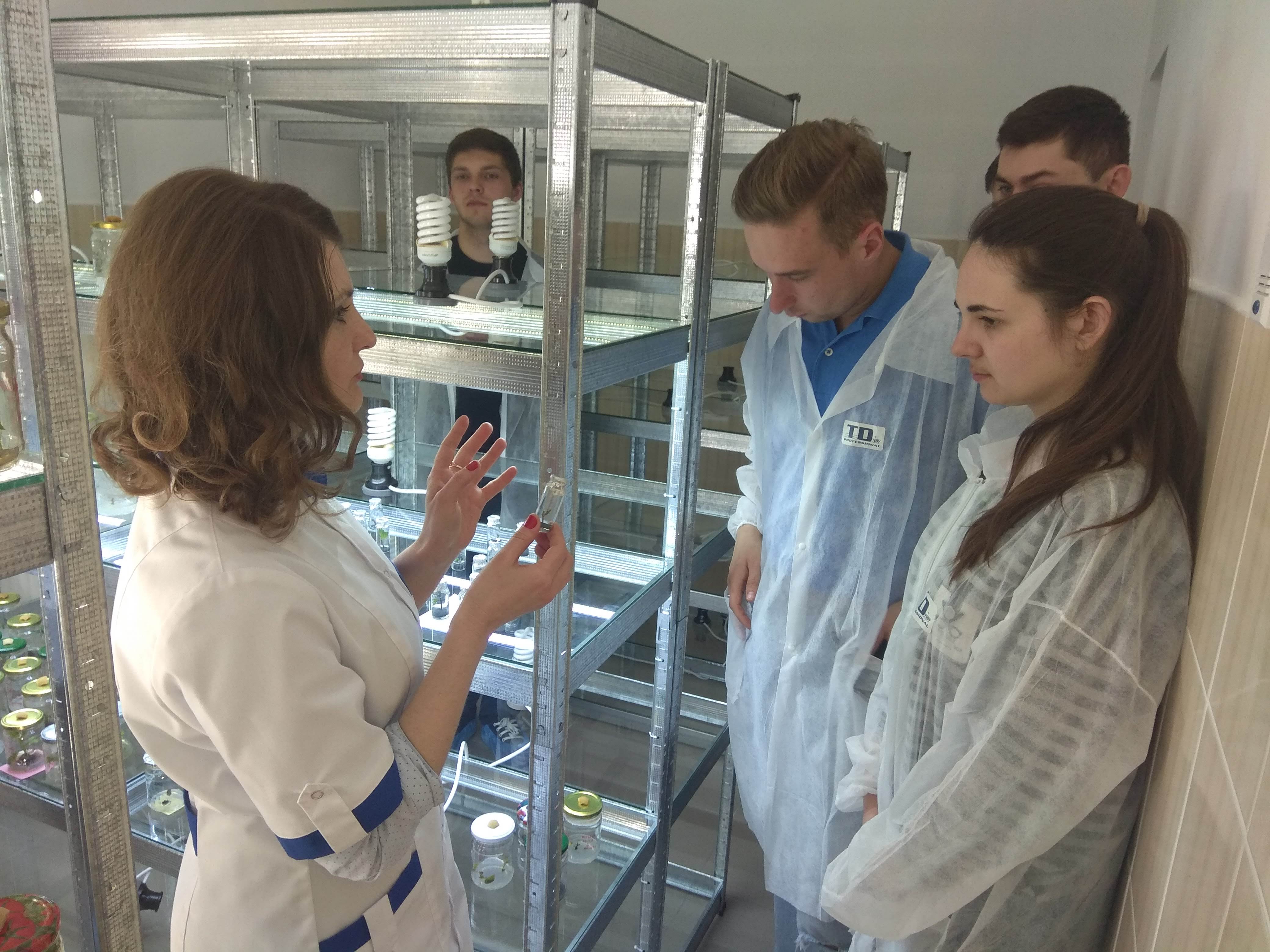 Практична частина семінару відбувалася у науково-дослідній лабораторії біотехнології рослин, де студенти ознайомилися зі структурою, напрямами діяльності, оснащенням, матеріально-технічним забезпеченням та продуктами діяльності лабораторії.