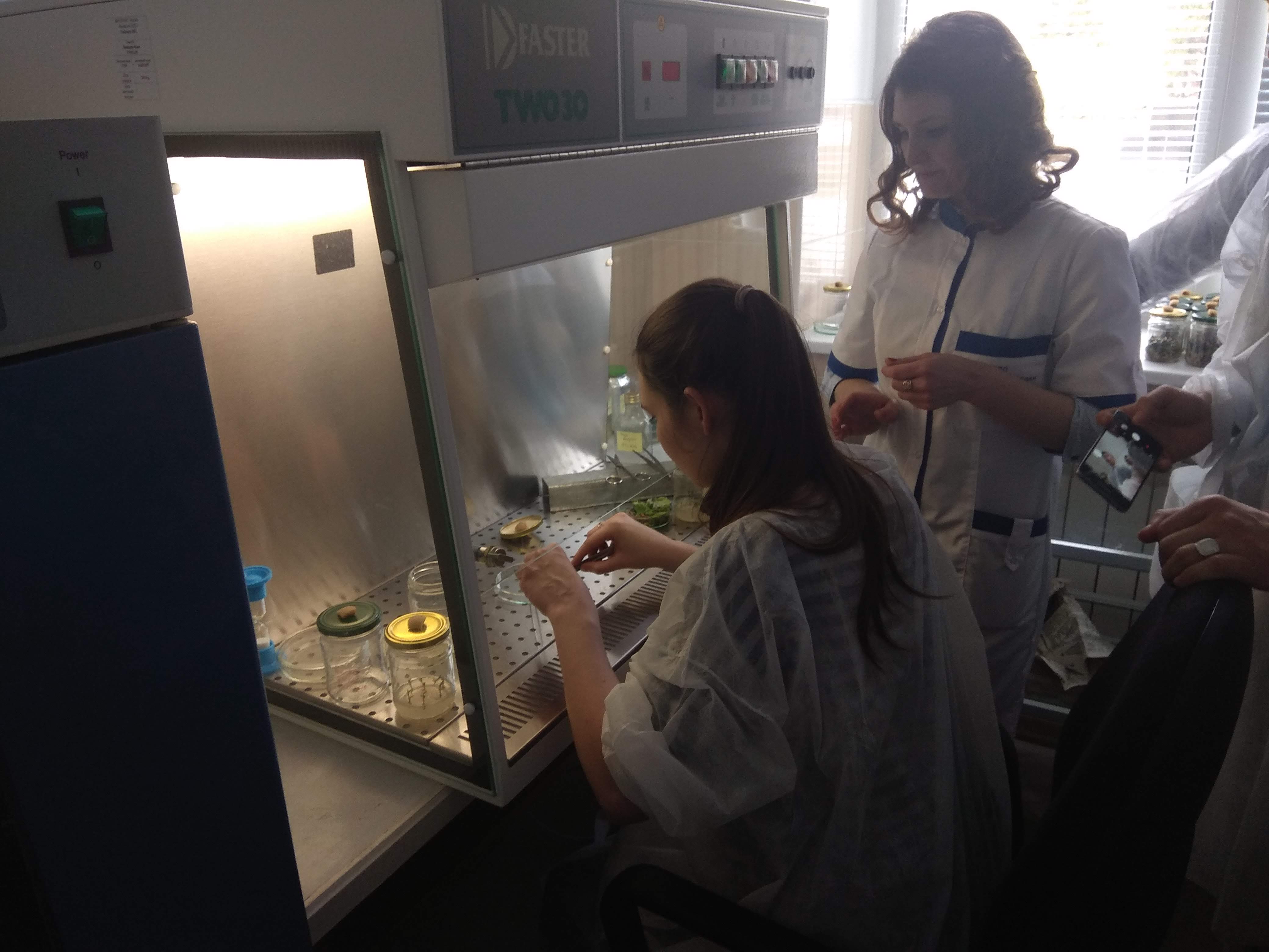 Крім того студенти мали змогу попрацювати у ламінарному боксі, зокрема виконати біотехнологічні операції із субкультивування деревних рослин in vitro для масового тиражування.