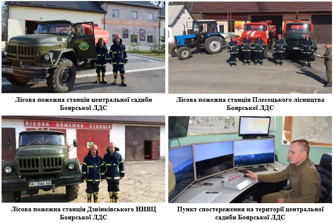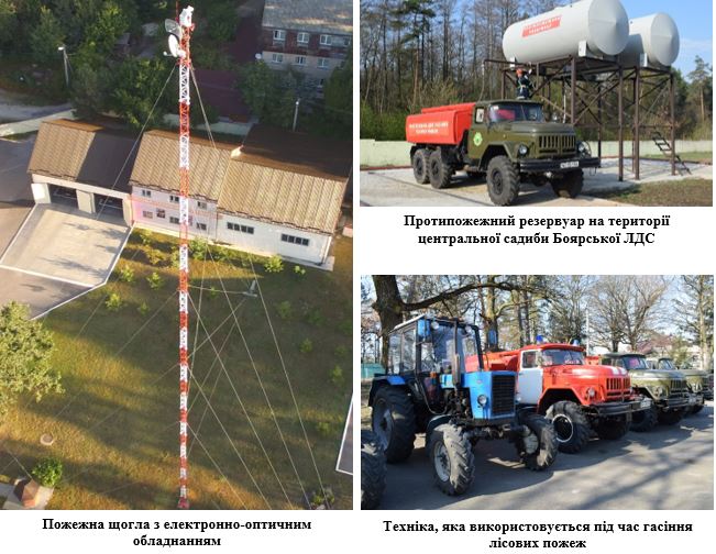 Системи раннього виявлення та реагування на пожежі в лісових масивах Боярської ЛДС. У пожежонебезпечний період спостереження за лісовим фондом здійснюється силами служби лісової охорони з використанням сучасної системи раннього виявлення та реагування на пожежі в лісових масивах. Система складається з 4 спостережних веж обладнаних оптичними камерами високої роздільної здатності та диспетчерського пункту, де розміщується робоча станція, система підтримки прийняття рішень, автоматизований пульт управління та монітори. У пожежонебезпечний період здійснюється цілодобовий моніторинг пожеж на всій території лісового фонду.