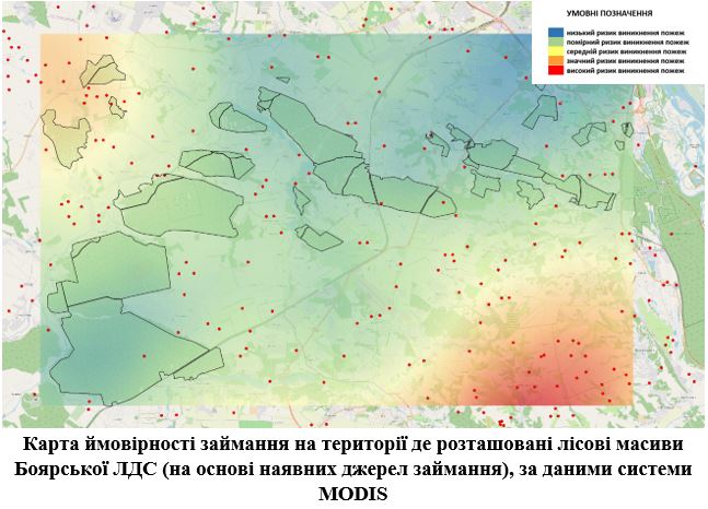 В межах наукової діяльності ВП НУБіП України, виконання науково-дослідної роботи 110/9-пр-2018 була змодельована карту ймовірності виникнення пожеж для території, на якій розташовані лісові масиви Боярської ЛДС. Таким чином на карті видно, що найбільші ризики виникнення пожеж спостерігаються поза лісовими масивами (полях, пустирях, сільськогосподарських угідь тощо), проте саме такі пожежі частіше за все стають причиною лісових пожеж.