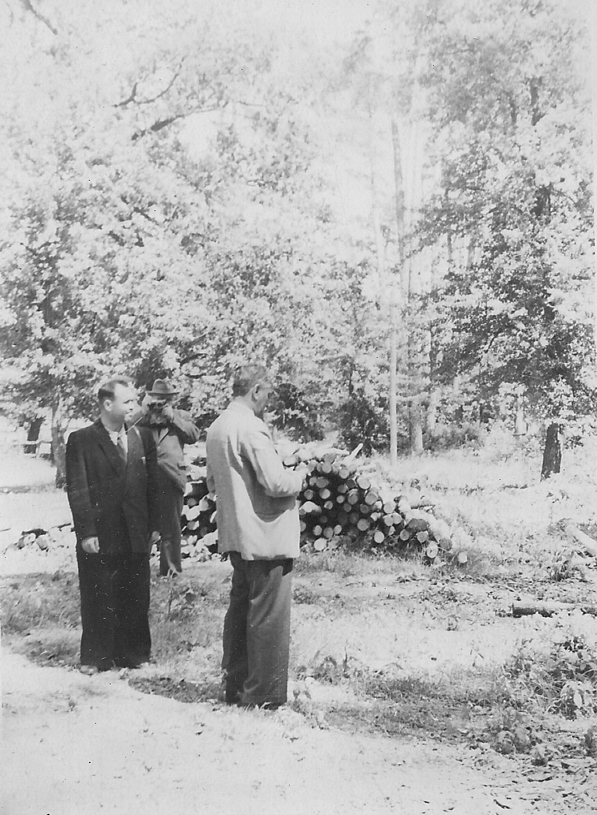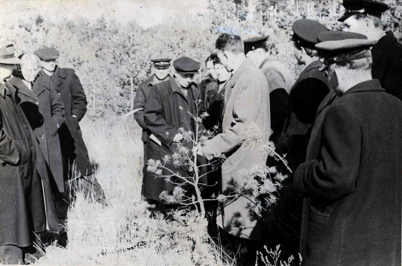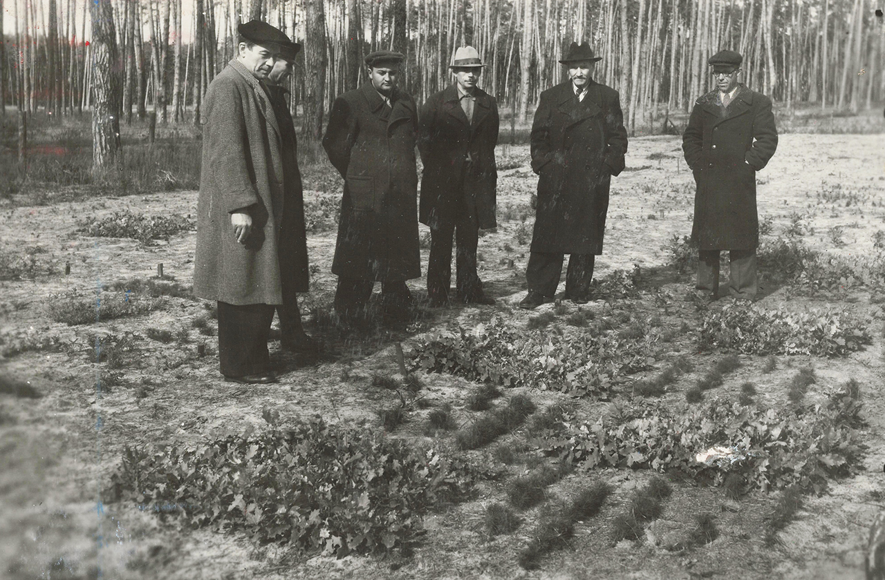 Фото 1. Заступник начальника Головного управління лісотехнічних і лісогосподарських ВУЗів Карпенко М. І. та директор Київського лісогосподарського інституту Шевченко В. А. в присутності керівництва лісгоспу директора Чернеги О. Н. та доц. Бикова М. К. (1948 р.)