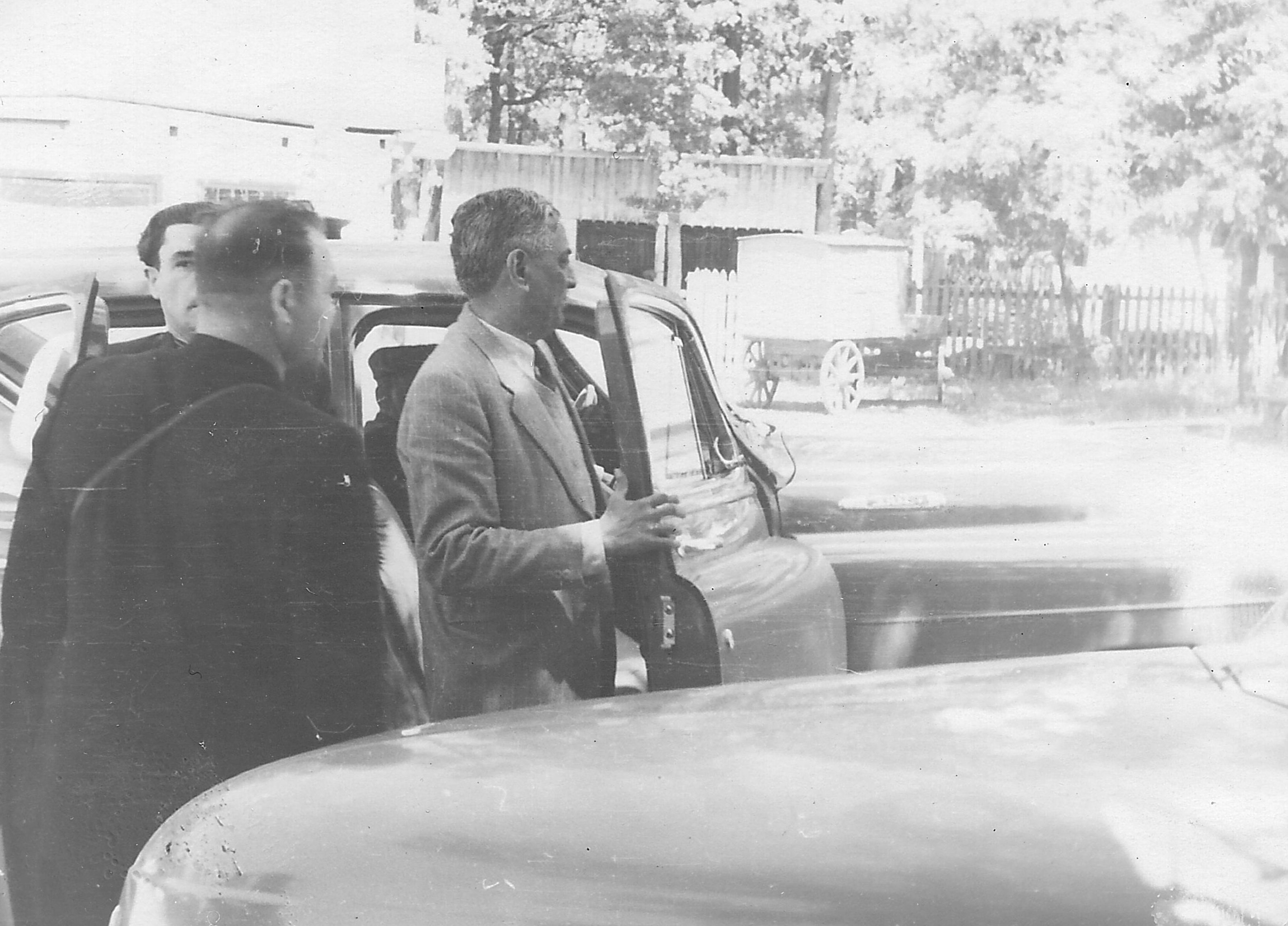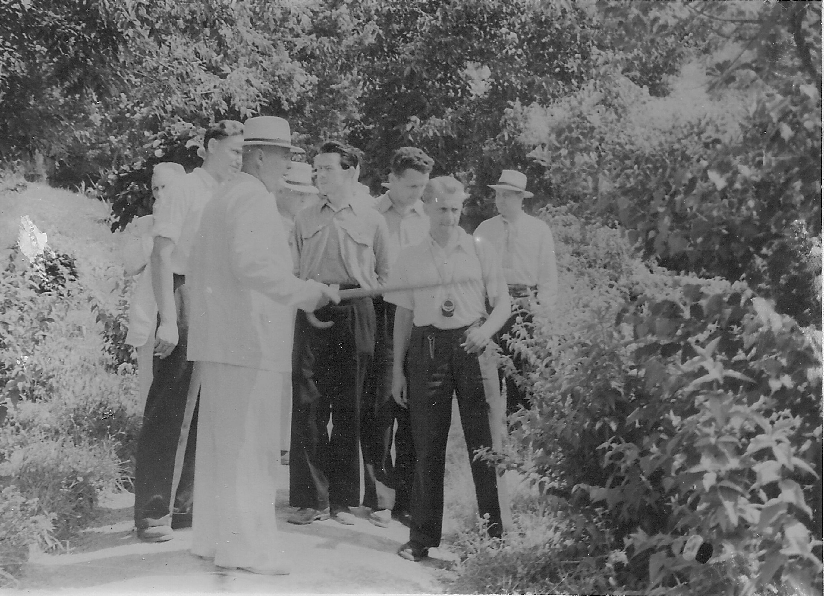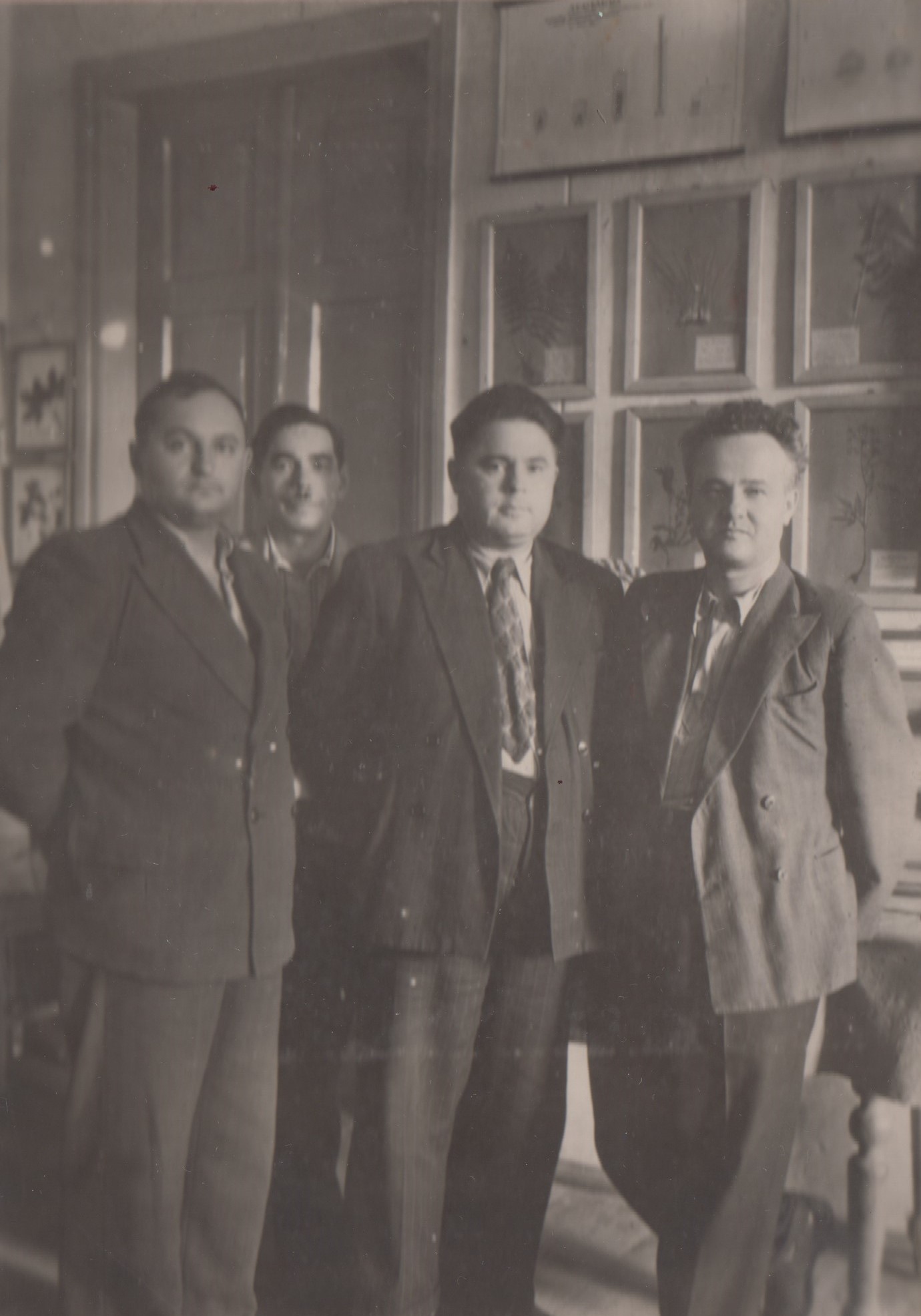 Фото 1. Заступник начальника Головного управління лісотехнічних і лісогосподарських ВУЗів Карпенко М. І. та директор Київського лісогосподарського інституту Шевченко В. А. в присутності керівництва лісгоспу директора Чернеги О. Н. та доц. Бикова М. К. (1948 р.)
