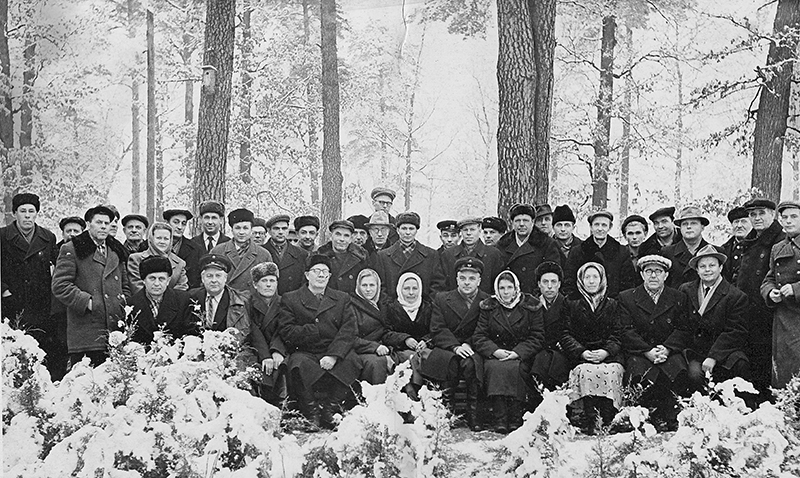 Фото 11. Огляд дослідних культур сосни звичайної у міжряддях яких посіяно люпин багаторічний під керівництвом проф. Б. Й. Логгінова. Жорнівське лісництво (1962 р.)