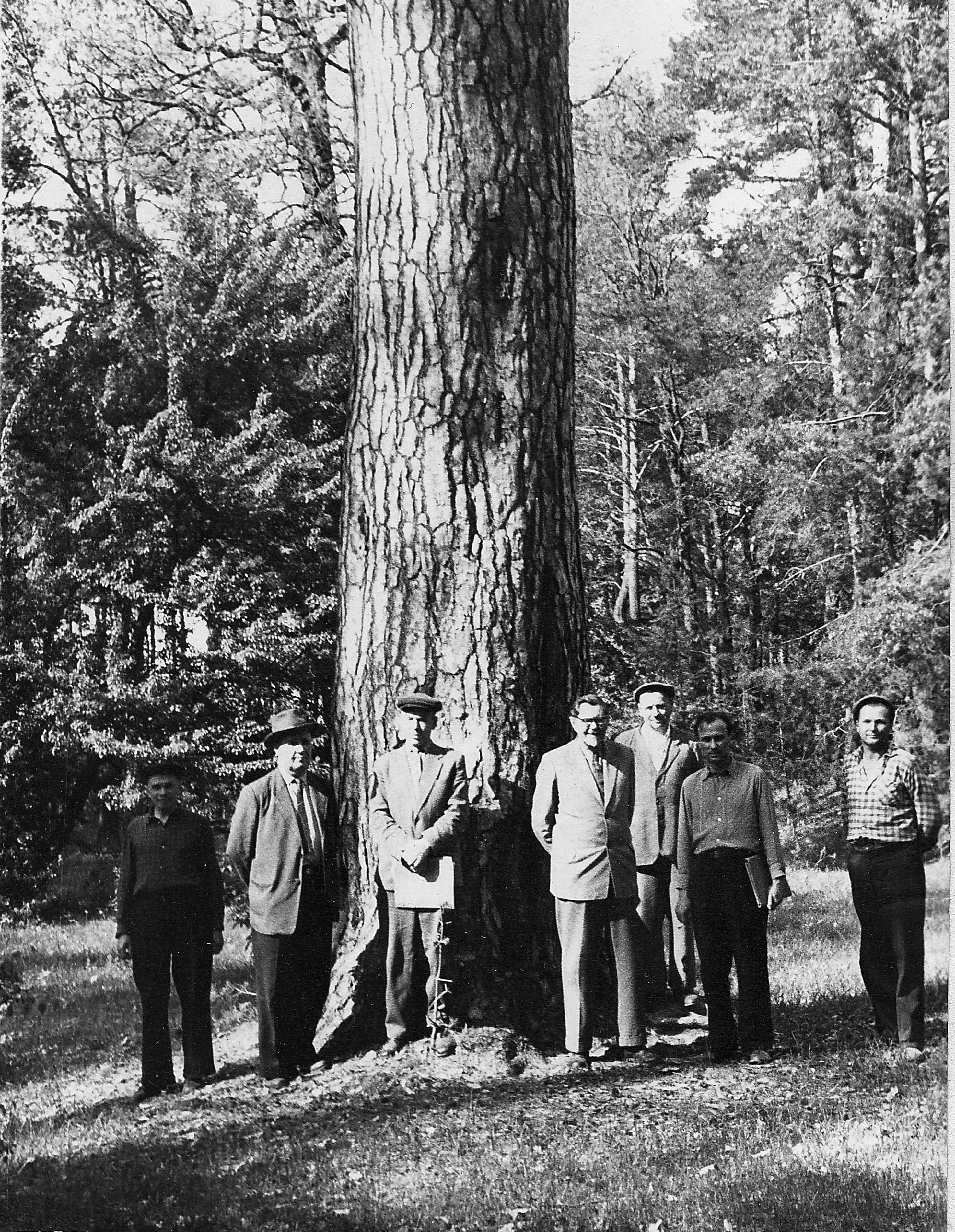 Фото 9. Культури сосни у Боярському лісництві, уражені підкоровим клопом. Обстеження проводяться за участі доц. кафедри лісової ентомології Падія М. М. (1961 р.)