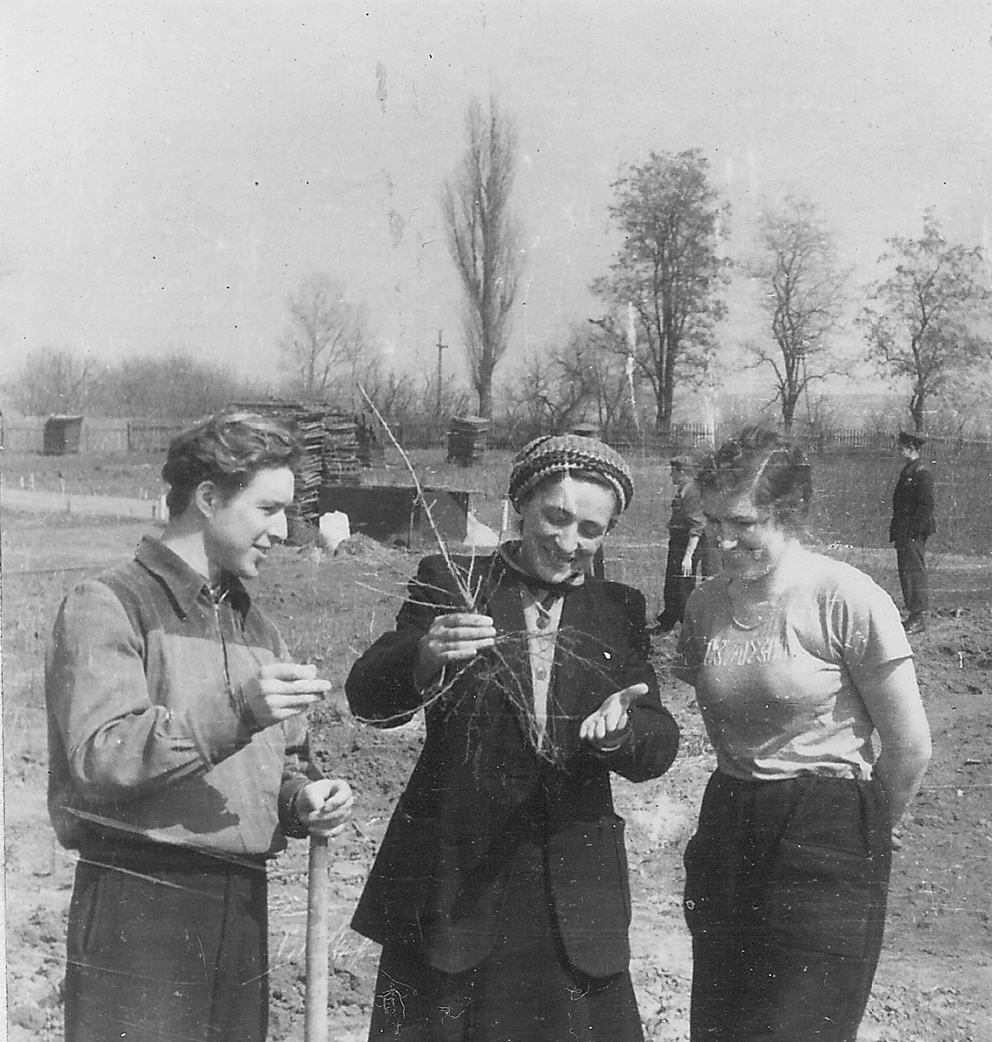 Фото 9. Студенти Київського лісогосподарського інституту разом із асистентом кафедри лісових культур Шумаєвой К. Г. оглядають кореневу систему саджанців, 1952 р