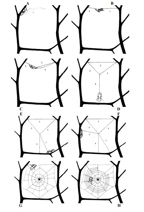 Стадії побудови ловчої сітки павуком Araneus sp. (за Heimer, 1988)