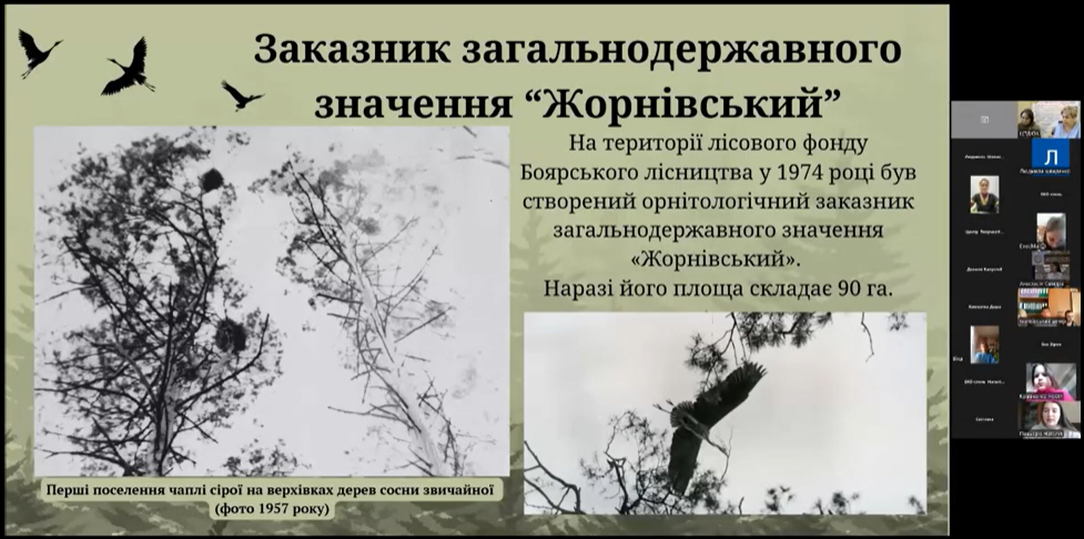Провідний інженер з науково-технічної інформації відокремленого підрозділу НУБіП України «Боярська лісова дослідна станція» Наталія Пацьора поділилася цікавою інформацією про орнітологічний заказник загальнодержавного значення «Жорнівський». Цей заказник, розташований на території Боярського лісництва, є важливою зоною охорони місць існування, гніздування, линяння та зимівлі птахів, зокрема сірої чаплі.