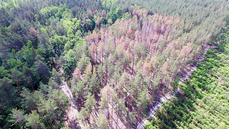 «В останнє десятиріччя санітарний стан лісів різко погіршився внаслідок негативної дії комплексу факторів, в основному пов’язаних із глобальними змінами клімату, що призвело до зростання площ всихаючих насаджень і масового пошкодження їх шкідниками і хворобами. За останні роки по всій території України спостерігається масове всихання більшості лісоутворюючих порід (ялини, ясена, дуба, граба, берези), але найбільше занепокоєння викликає стан соснових насаджень, де пошкодження ослаблених лісів стовбуровими шкідниками, в основному сосновими короїдами, набули катастрофічних масштабів. Станом на 01.01.2019 загальна площа всихання лісів становила більше 413 тис. га, з них насаджень сосни звичайної – 222 тис. га, ялини європейської – 27 тис. га, дуба звичайного – 100 тис. га та інших насаджень – 64 тис. гектар. Таким чином, масове пошкодження соснових лісів стовбуровими шкідниками, зокрема верхівковим і шестизубим короїдами, продовжує поширюватися на території країни», - сказав він.